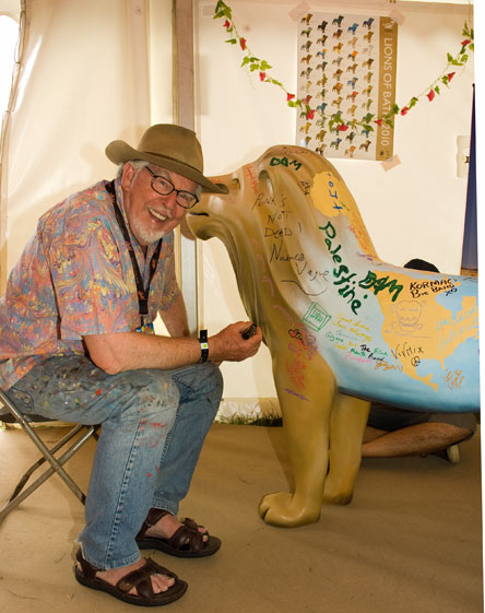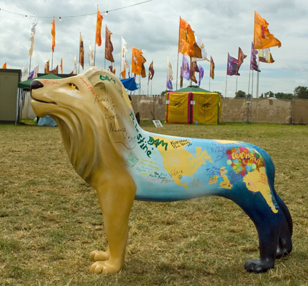 As WOMAD's logo is a lion, it seemed natural for one of the Lions of Bath sculptures to take part in the event. The sight of a 6ft fibreglass lion standing in the musicians' VIP tent attracted many of the hundreds of festival's performers to decorate and sign him, including Tuareg musicians from the Sahara, Palestinian and Ethiopian bands, American rap artists, Cuban and Burundi singers, the hugely popular Australian entertainer and artist Rolf Harris and WOMAD founder Peter Gabriel.
