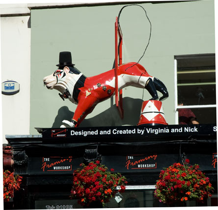 One of the more unusual lions to have taken up residence in Bath recently is "The Lion Framer". Decorated as a traditional lion-tamer, "The Lion Framer" is the only lion in Bath with a different paw configuration as his sponsors adapted him to leap through a giant picture frame above the entrance of The Framing Workshop in Walcot Street.