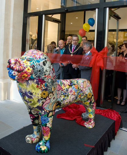 The opening of Debenhams, Bath's newest department store recently was a roaring success! Taking pride of place outside the entrance to the store was "FloraLeo", the latest addition to the Lions of Bath pride, painted by top British fashion designer Jeff Banks.