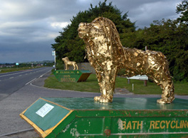 A pair of magnificent golden lions took up residence this summer on top of skips outside the Bath Recycling Skips HQ on the A376 between the Odd Down Park & Ride and Peasedown St John to the South of Bath, amazing motorists and providing some excellent entertainment for slow-moving commuter traffic!