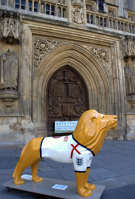 The Bath Lion was displayed in pride of place outside the Roman Baths in Abbey Churchyard, within a whisker of the footballing lion, 'Wayne Roarney', which took up residence outside the magnificent Bath Abbey, founded in 1499