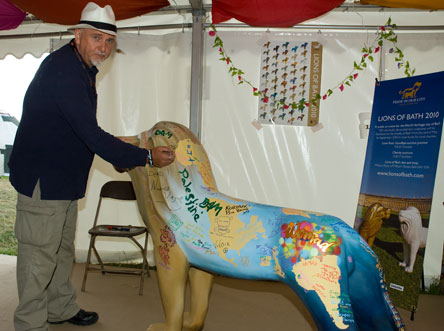 As WOMAD's logo is a lion, it seemed natural for one of the Lions of Bath sculptures to take part in the event. The sight of a 6ft fibreglass lion standing in the musicians' VIP tent attracted many of the hundreds of festival's performers to decorate and sign him, including Tuareg musicians from the Sahara, Palestinian and Ethiopian bands, American rap artists, Cuban and Burundi singers, the hugely popular Australian entertainer and artist Rolf Harris and WOMAD founder Peter Gabriel.